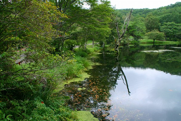 | 駒出池にも紅葉した葉が水面に浮いている |