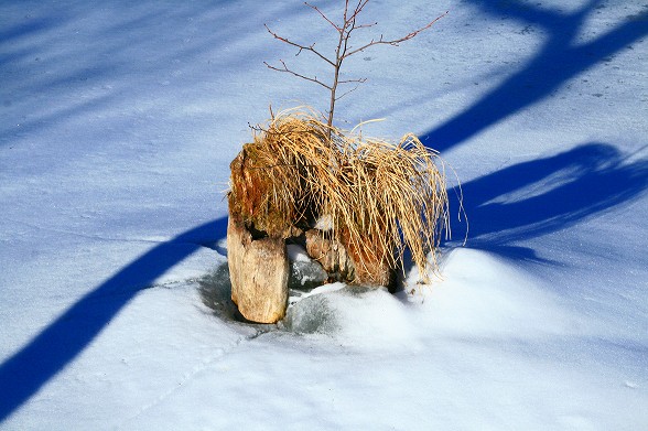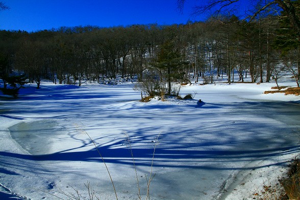 高原の道路わきの雪も大分増えましたが日中の日差しは強くなってきました。 ただ、積雪もまだ油断できません。樹影や雪景色が綺麗です。駒出池は 全面雪におおわれていますが水量が減っています。 |