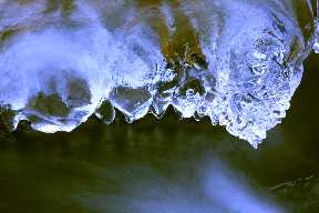 八千穂レイクもこのところの寒さで湖面全体の半分ほどが凍っている。氷の一番厚いところで2cmほど だ。氷と水面との境が笹波だってきらめく様はたとえようのないほど美しい。大石川の渓流の氷も 今が見頃で雪が降る前までが良い、雪が降ると氷が隠れてしまったり雪が解けて凍ると透明感が なくなってしまう。渓流の周りでは霜の花が咲いた枯れ葉がフォトジェニックである。 |